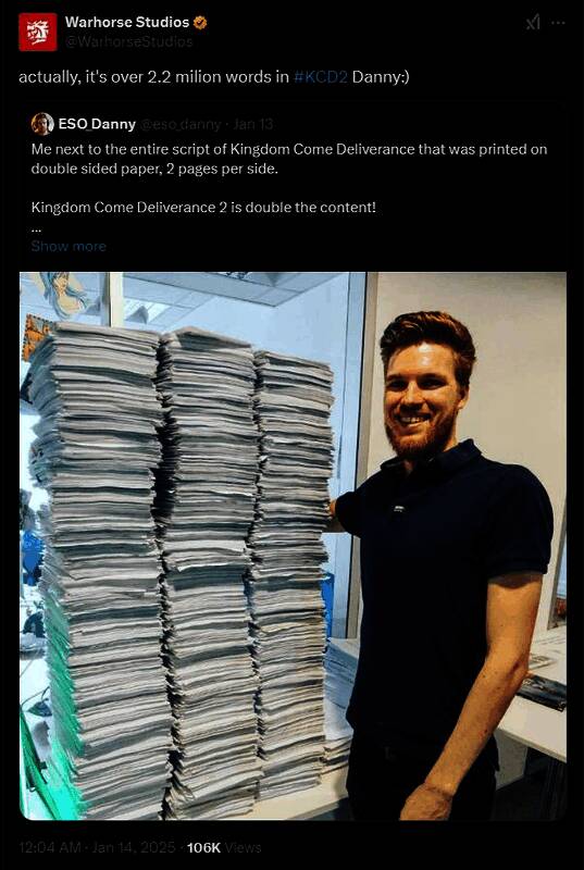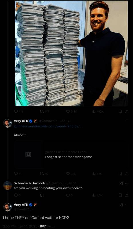 要知道目前经过吉尼斯世界纪录认证的最长游戏剧本为《博德之门3》,其字数超过200万。面对《天国:拯救2》的“挑战”,拉瑞安工作室的发行总监Michael 'Cromwelp' Douse也在相关推文下回复说:“我希望他们能做到!迫不及待地想看到《天国:拯救2》。”
