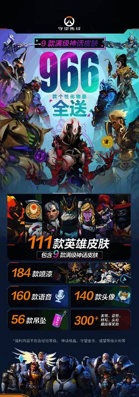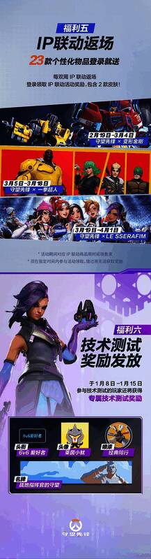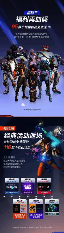 为期8天的《守望先锋》国服回归测试现已结束,暴雪官方现在公布了国服回归奖励,在2月19日国服回归上线时间,游戏将为所有国服玩家(包括新注册玩家)送出:第1赛季-第9赛季的9款满级神话皮肤,第1赛季-第9赛季的免费+付费高级战令奖励,第10赛季-第14赛季的免费战令奖励,还有可通过挑战活动赢取的限时返场奖励,累计966款个性化物品。