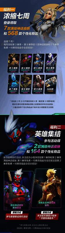 · 参与官网、官方小程序预约活动及社媒活动,免费得第1赛季-第2赛季2款满级神话皮肤和164款个性化物品