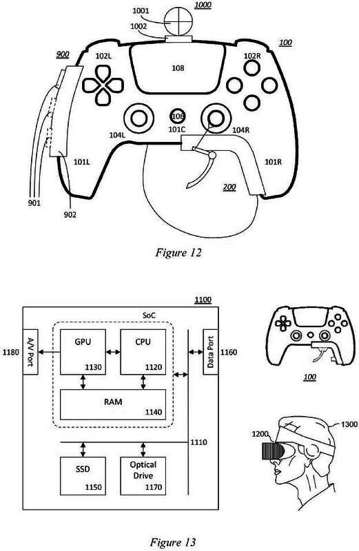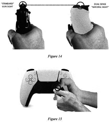 其中一项专利于去年6月提交,在本月初才公布,这是一种为PS5 DualSense手柄添加额外扳机配件,来实现将手柄当做枪械来瞄准射击的新技术,其中可以看到DualSense手柄的R1和R2肩键中的空隙将被当做枪械的瞄准镜来使用。