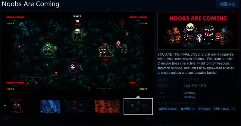 今日(1月15日),竞技场Roguelike游戏《Noobs Are Coming》Steam页面开放,2025年第一季度发售,暂不支持中文,感兴趣的玩家可以点击此处进入商店页面。