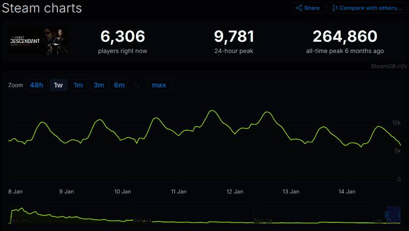 《第一后裔》在2024年夏季通过免费游玩模式,吸引了不少玩家,Steam玩家数峰值曾达到26.4万人。然而六个月后,《第一后裔》玩家流失超95%,目前最高峰值仅为9781人。