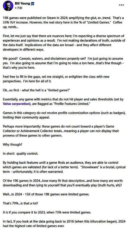 对此Bill Young解释了何为“受限游戏”,那就是Valve公司为Steam平台设定的以销量和玩家数量为标准,来确定一款游戏是否可以为玩家提供徽章、掉落卡牌等内容的功能。而那些未达到指标的游戏就会成为“受限游戏”,并且被标记为“个人资料功能受限”。
