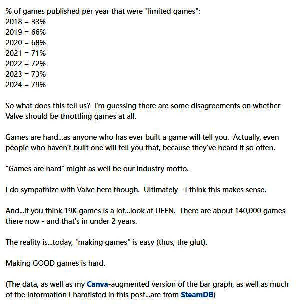 Bill Young通过SteamDB等第三方平台的数据统计发现,2024年中有15000款新游戏属于“受限游戏”,这在全部新游戏中的占比高达79%。