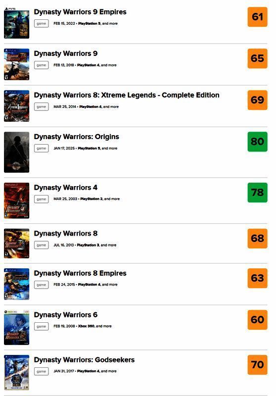 在《真三国无双:起源》之前,《真三国无双》系列的M站均分通常都在65左右,很少突破70。此前评分最高的游戏是2003年PS2版《真三国无双4》,M站均分78,而在这款游戏发售20年后,新作《真三国无双:起源》终于超过了它。