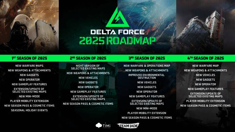 发行商TiMi Studio Group于1月14日今天公布了旗下战术射击竞技游戏《三角洲行动》公布2025年内容规划路线,计划将举行4个赛季,每个赛季追加新内容,敬请期待。