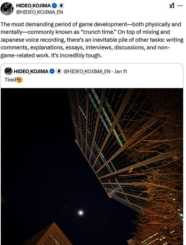小岛秀夫还感慨道:“到了这个年纪,我不禁会想,我还能‘创作’多久。我想在有生之年继续创作,但能坚持10年?20年吗?每天我都感觉在和时间赛跑。”