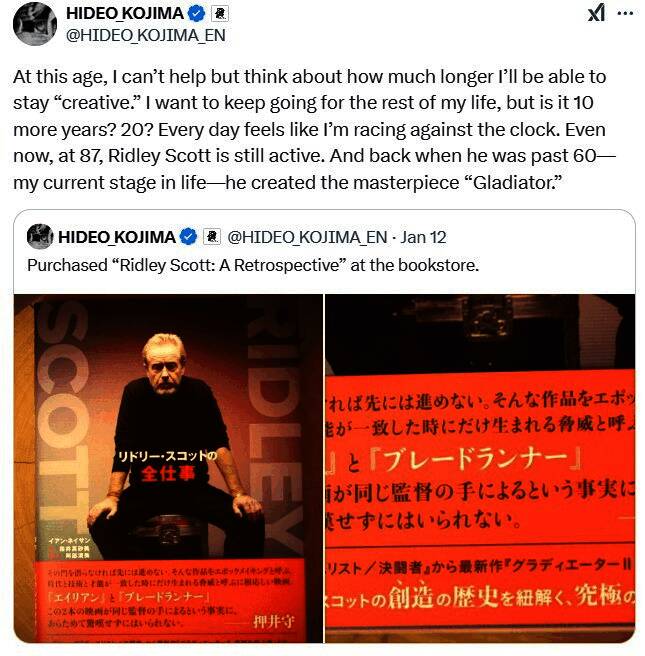 小岛秀夫还对“科幻电影教父”雷德利·斯科特献上敬意,他说:“即使是现在,87岁的雷德利·斯科特(Ridley Scott)仍很活跃。当他60多岁时——也就是我现在的人生阶段,他创作了杰作《角斗士》。”