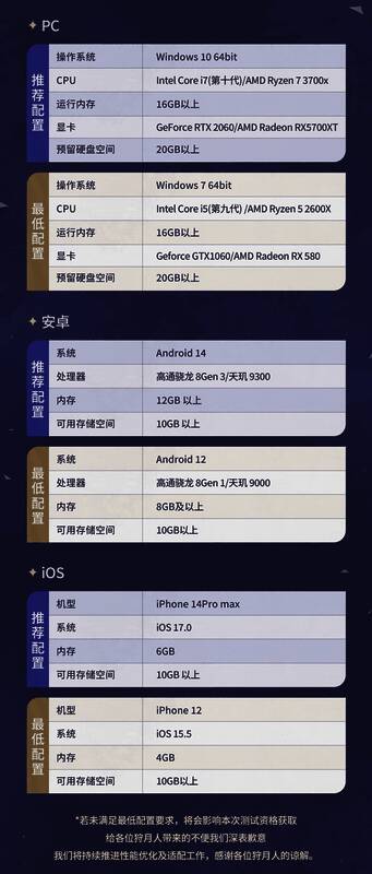 「狩夜测试」的性质为限量删档不计费,平台为PC、安卓和iOS,各平台配置需求如下: