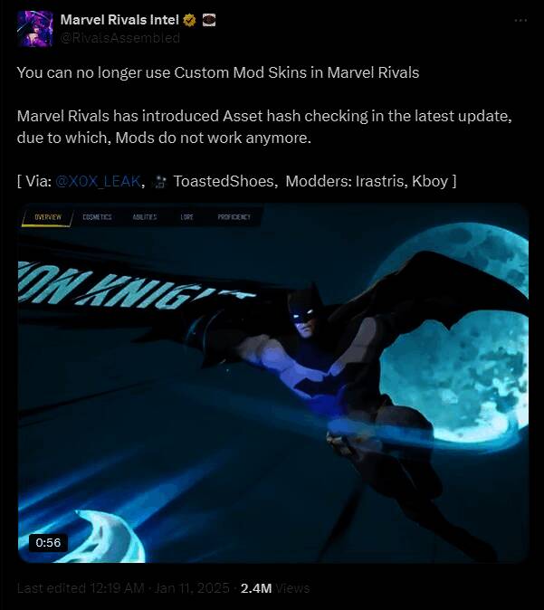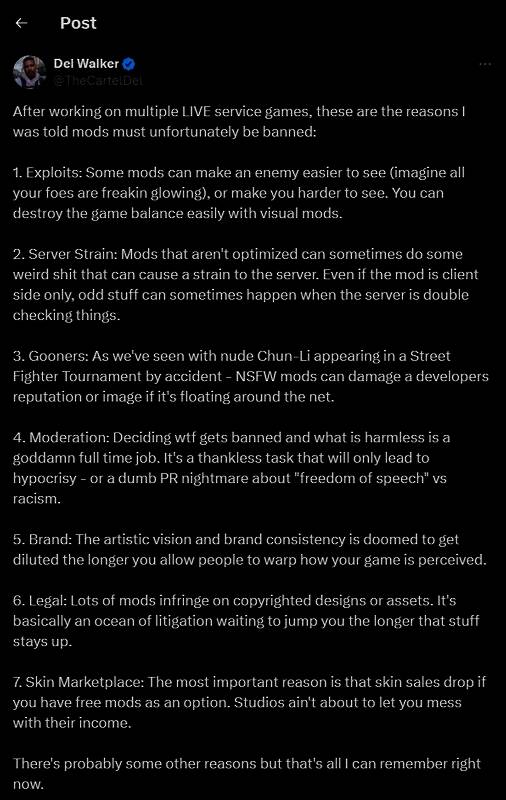 对于这样的改动,有不少玩家感到遗憾,毕竟游戏此前已经有着不小的MOD社区和MOD内容(例如DC英雄的MOD),但也有玩家表示理解。其中曾在Rocksteady和世嘉等游戏公司有着资深开发经历的Del Walker,在推特上发文解释了为何许多热门多人游戏都选择禁用MOD。