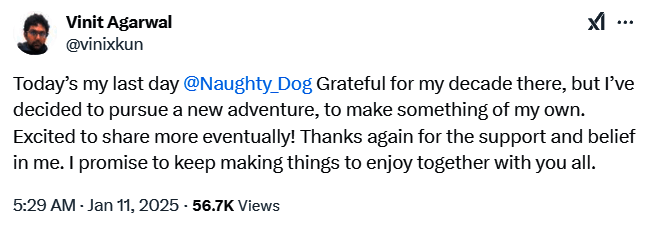 Vinit Agarwal在顽皮狗工作了10年,参与了《最后的生还者2》《神秘海域:失落的遗产》《神秘海域4》等游戏的开发工作。他没有说明离开顽皮狗的原因,以及接下来的去向。