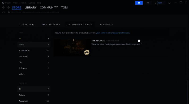 在Steam平台上搜索Valve,然后通过筛选“即将发布”的项目,再具体筛选到游戏类别,确实会列出两个项目——但只有《死锁》是可见的。