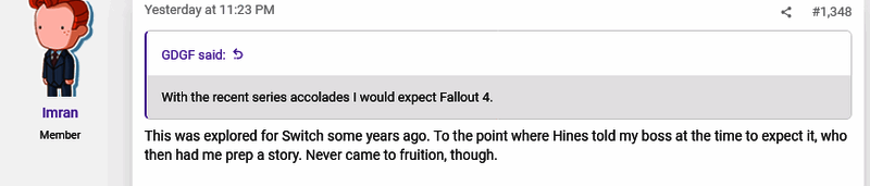 除了《辐射:避难所》这样的衍生作品以外,《辐射》系列没有一部作品登陆了 Switch 主机。在 Resetera 上随口提到时,Imran表示 Switch 版本的《辐射4》“在几年前进行了探索”,并且当时 Hines通知了他所在媒体的负责人它即将公布,并让他准备了一个故事。但最终这它没有实现。