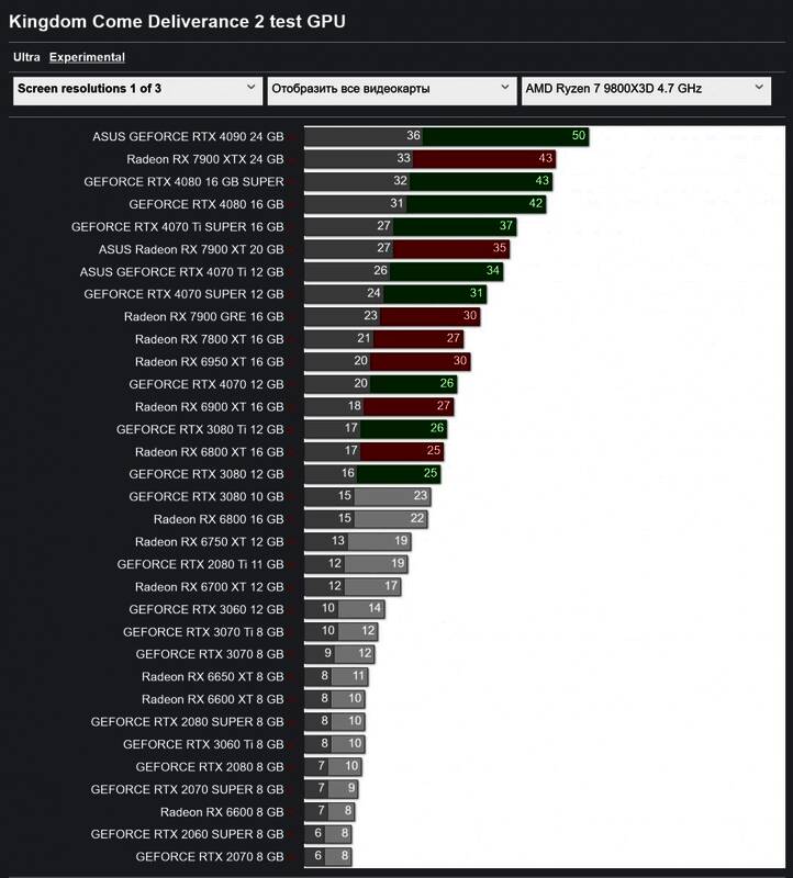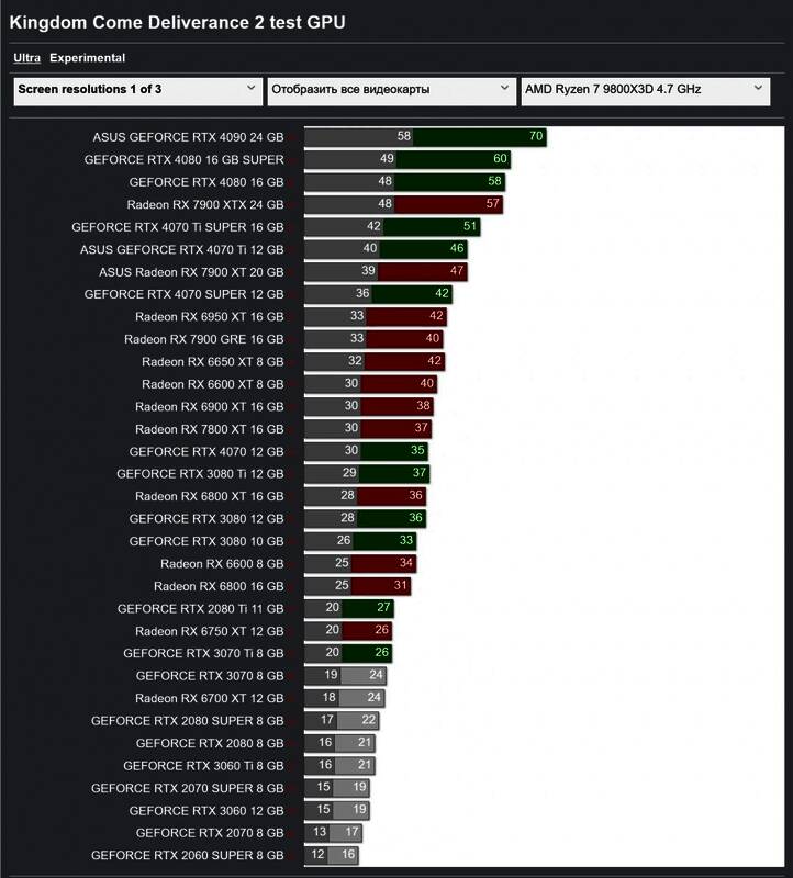 GameGPU测试了前瞻版本,分享了以下跑分图。《天国:拯救2》在“最高(Ultra)”画质下还有“极高(Experimental)”画质,这个设定可能是面向未来GPU。极高设定很有可能是采用了光追特效。