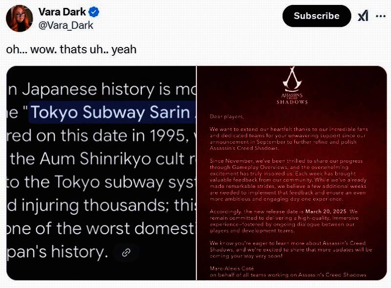 记者Vara_Dark发推文称,30年前即1995年3月20日,在日本国内发生了一起严重的恐怖袭击事件——东京地铁沙林毒气事件,而《刺客信条:影》也在同一天发售,这就有点无语了。