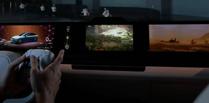 另一个亮点就是车内配备的全宽屏幕仪表板,使用者介面(UI)、地图和辅助驾驶功能以虚幻引擎打造,并内建PS5主机功能,透过5G网络连接家里的PS5,随时随地享受远端游戏。
