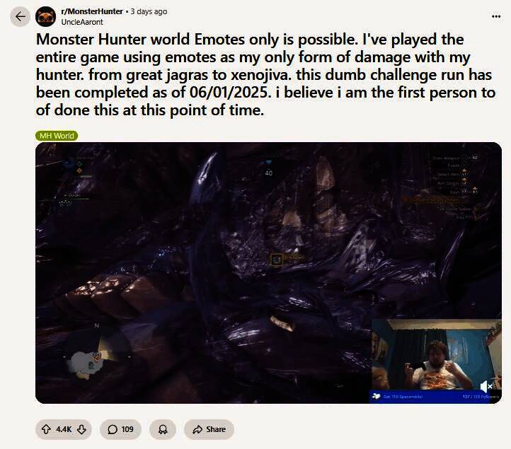 据外媒“GamesRadar+”采访报道,Aaron很早之前就开始了挑战,但由于“生活安排”而无法继续,直到《怪物猎人:荒野》测试结束后他才重新萌生了挑战的想法。