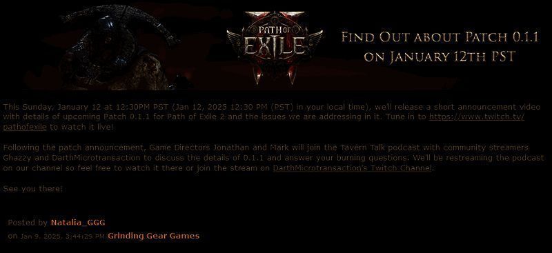 于 12 月刚刚推出的热门 ARPG《流放之路2》开发商 Grinding GearGames 宣布,将与太平洋时间 2025 年 1 月 12 日中午 12:30(北京时间 1 月 13 日早上 4:30)发布一个全新的视频,介绍游戏将发布的 0.1.1 版本补丁。