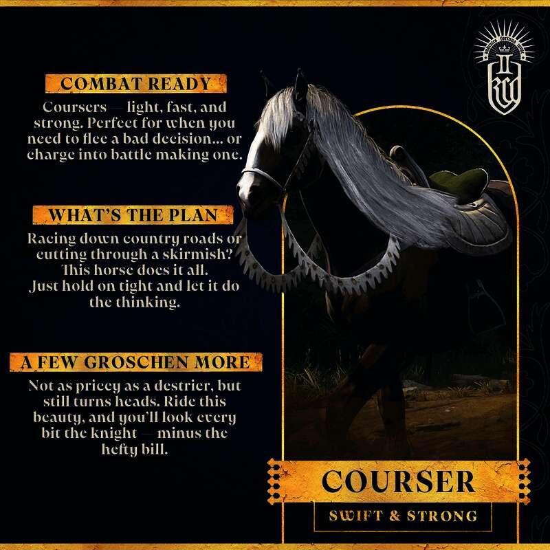 近日Warhorse工作室透露了《天国:拯救2》马匹新细节,每一种马都具有自己的特色。官方介绍了三种类型的马匹:通用马(Rouncey)、骏马(Courser)和战马(Destrier),一起来看看吧!