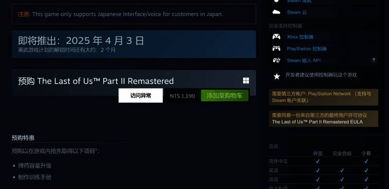 索尼确认《最后的生还者2:重制版》在今年4月3日登陆PC时,还是需要一个PSN账户才能游玩。目前该作已经上架了PC Steam和Epic平台,Steam国区345元,自带简体中文。