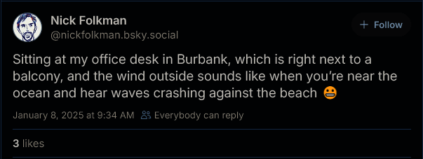 《漫威蜘蛛侠》开发商 Insomniac Games 总部也距离另一处的伊顿火灾不远。工作室编剧 Nick Folkman 在社交媒体上写道:“坐在我位于伯班克的办公桌旁,外面的风声听起来就像你在海边时听到的海浪拍击海滩的声音。”