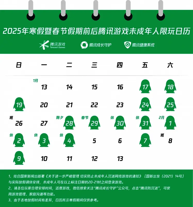今日(1月9日),腾讯游戏发布2025年寒假暨春节限玩日历,未成年玩家32天假期内仅有15小时游戏时间。