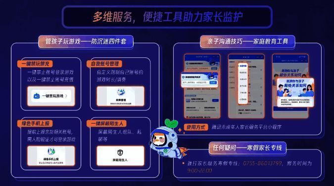 管孩子玩游戏——“防沉迷四件套”管理工具亲子沟通技巧——家庭教育工具任何其它情况——寒假家长服务专线
