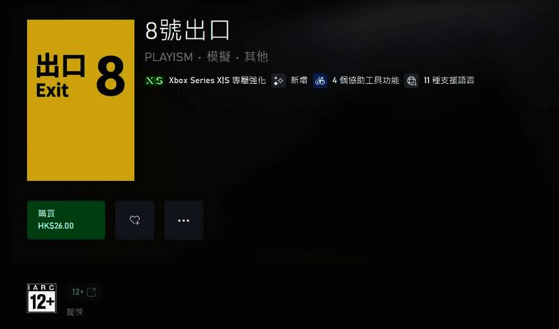 1月9日,由PLAYISM开发的短篇步行模拟游戏《8号出口》现已正式登陆Xbox Series X|S,港服售价26港币(约合人民币24.5元),支持中文。