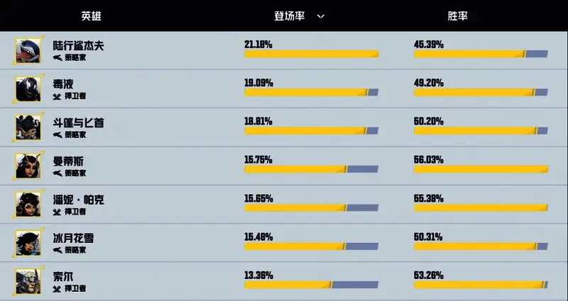 热门竞技动作射击游戏《漫威争锋》官方日前在官方网站上公布了游戏发布至今的英雄热度榜,展示了各个角色的热度和胜率。其中不乏一些比较有趣的数据。