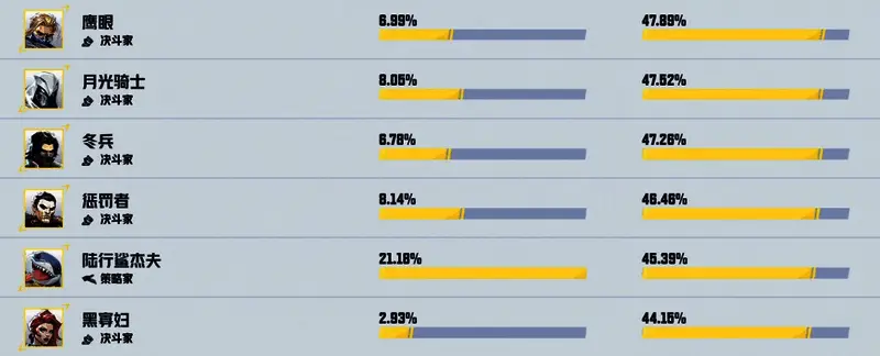 胜率方面,大师段位以上浩克排名第一,其次是魔剑客和铁拳。但需要考虑到这些角色登场率很低,因此数据并不准确。
