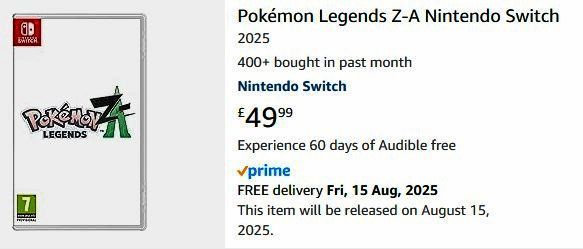 近日,英国亚马逊突然将《宝可梦传说Z-A》的预购发售日期标记为了2025年8月15日,如果一款游戏没有发售日期的话,那么其默认的日期应该是2025年12月31日(占位符)。目前,该页面已经恢复至了默认的2025年12月31日,考虑到英国亚马逊与任天堂关系良好,它们提前获得游戏发售日期的可能性并不小。