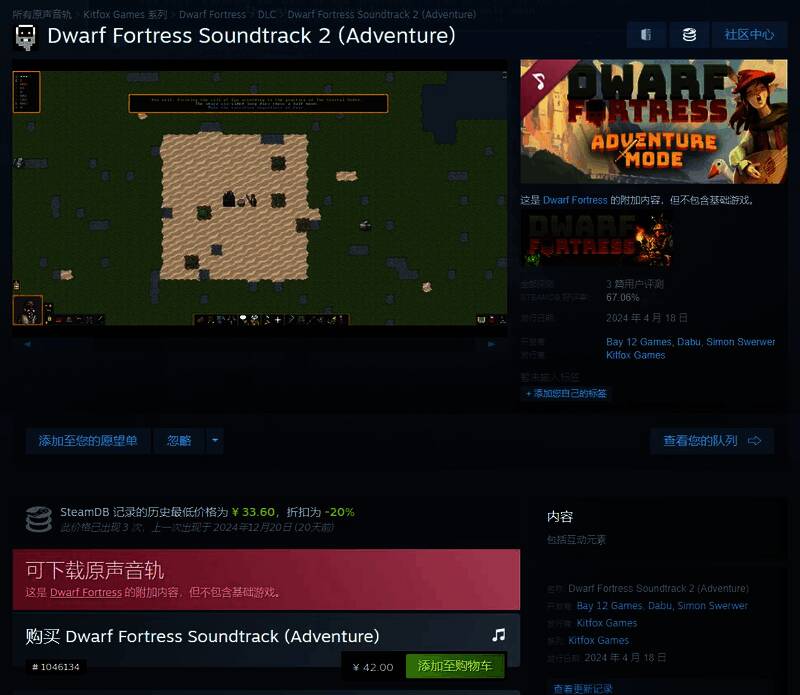 “冒险模式”也将作为《矮人要塞》的DLC在Steam平台推出,目前该DLC国区原价为42元,根据SteamDB数据显示,目前该DLC最高折扣后价格为33.6元。