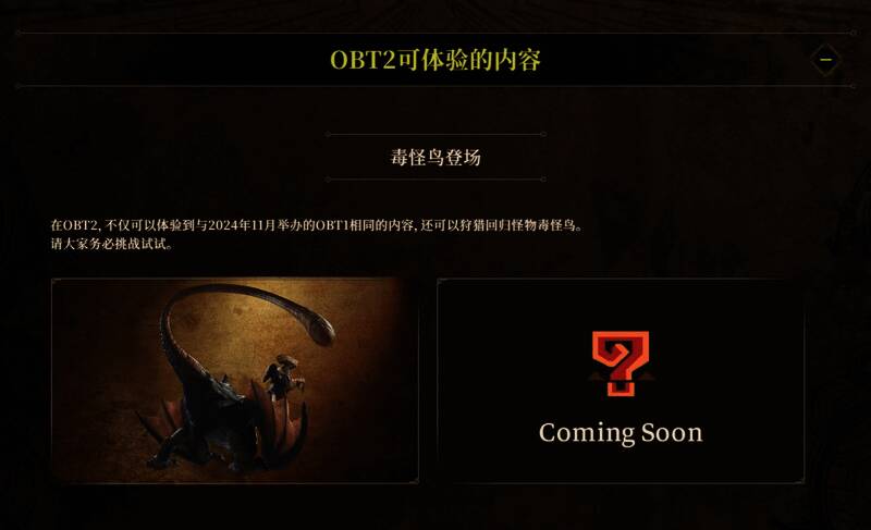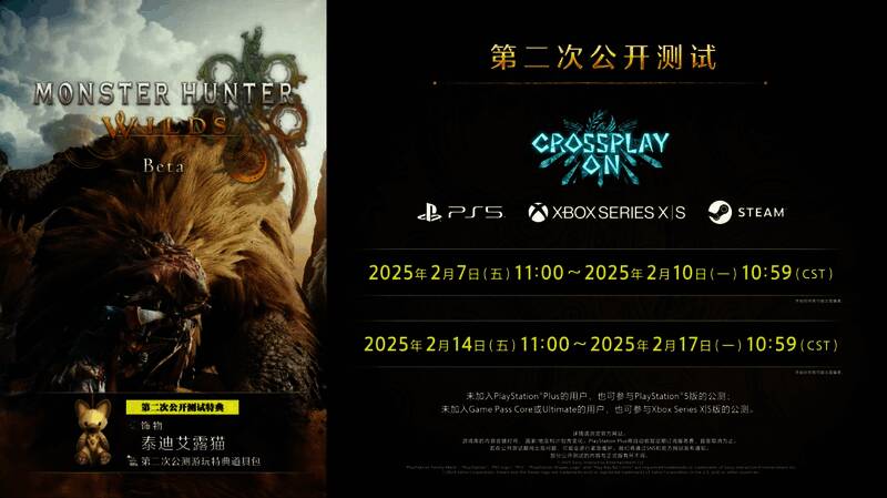 1月8日,卡普空发布了《怪物猎人:荒野》游戏制作人辻本良三送上的新年祝福,并宣布将举行第二次公开测试,时间为:2月7日11:00至2月10日10:59,以及2月14日11:00至2月17日10:59,平台为PS5、Xbox Series X|S和Steam。除了第一次公开测试可以体验的内容外,本次测试还新增了回归怪物“毒妖鸟”的狩猎任务。