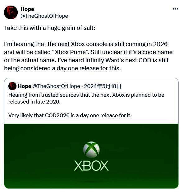 首先,Ghost of Hope表示他听说Xbox下一代主机将于2026年,虽然可能有很多人不相信这一点,但这在游戏行业内这已经是公开的秘密了。据悉,该主机将被称为“Xbox Prime”,目前还不清楚这是开发代号还是实际名称,并且Infinity Ward的新《使命召唤》游戏正在考虑被用作新主机的首发护航。