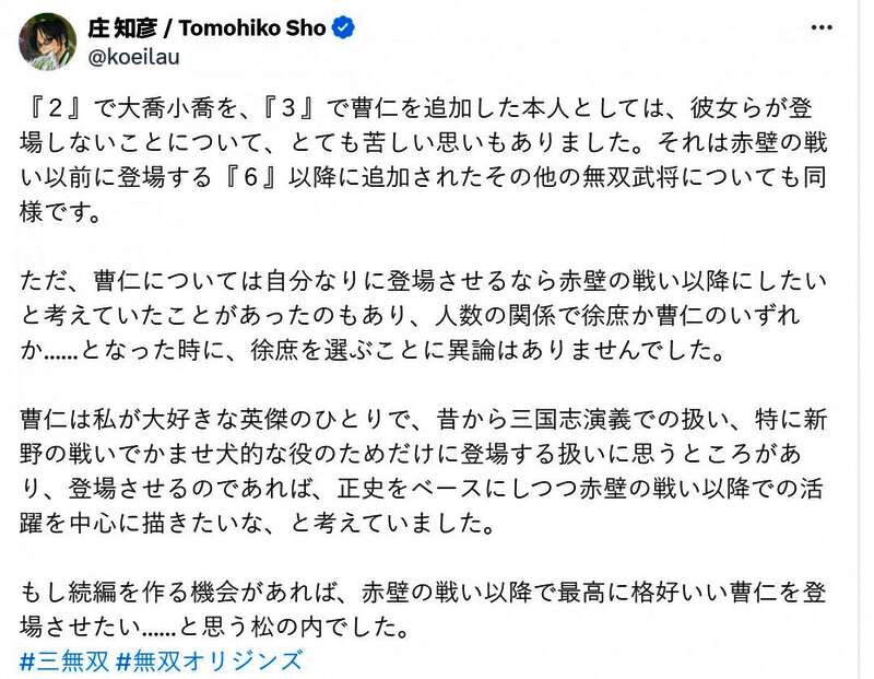 他说:“作为在《2》中加入了大乔、小乔,在《3》中加入了曹仁的本人,看到她们没有登场的情况,我内心感到十分痛苦。对于《6》之后追加的那些在赤壁之战前登场的其他无双武将,我也有同样的感受。
