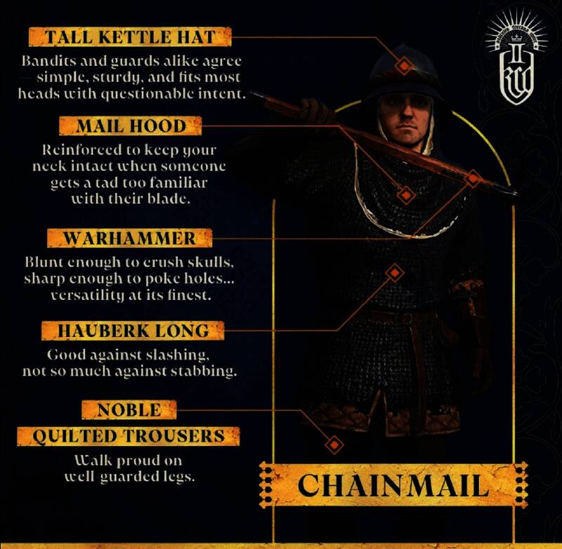 此次官方介绍了《天国:拯救2》的链甲、镶甲和板甲。链甲兜帽能很好地保护穿戴者颈部,还能完美地抵御砍击,但对刺击的保护作用很小。