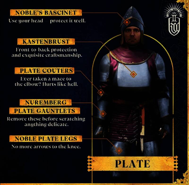 板甲的防护性能最可靠,弱点也最少。护腿可抵御射向膝盖的箭矢,胸甲可保护穿戴者免受前后胸的打击。头盔在保护头部的同时不会限制视野。不过板甲也有缺点,它非常沉重,限制了穿戴者的灵活性。