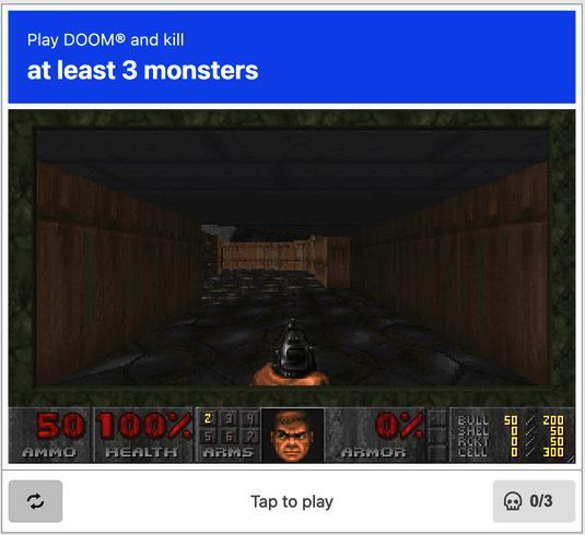 当然,你不需要特地试图去找一个网页看看自己能不能碰到这个验证,因为有单独的网页供你尝试。就像大多数电脑硬件或软件的硬性标准一样,它们合格的标准就是运行《毁灭战士》、《孤岛危机》或是“BadApple”,而人机检测现在也达标了。
