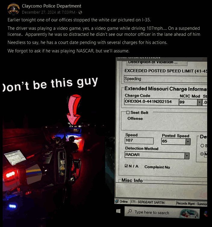 警局负责人称,当时这位骑警正在参与一项查酒驾的大规模行动,但发现一位司机在限速 65 英里/小时(约 104 公里/小时)的公路上超速驾驶。在被停下后,他被发现没有驾照,虽然当时没有立刻被捕,但是被禁止驾驶,并必须由另一位司机来开车。