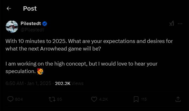 近日Arrowhead的首席执行官兼《绝地潜兵2》创意总监的Johan Pilestedt,在其个人推特上发文表示正在为工作室下一款游戏研发“高概念(high concept)”,并且询问玩家对新作品有哪些期待和愿望。