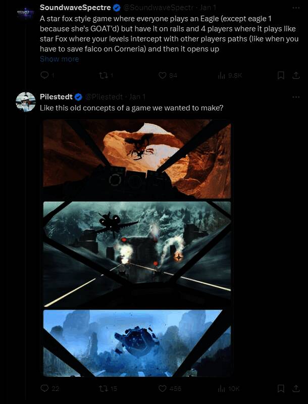 值得一提的是,对于Pilestedt所说的高概念,有玩家在推特中建议可以做一款《星际火狐》风格的游戏,让每位玩家都扮演一只鹰(共允许4名玩家在轨道上),在各自通关的路径最后与同一个BOSS相交并一起战斗。对此Pilestedt也亮出了几张工作室之前设计的飞行射击游戏的概念图,表明已经有过类似的想法。