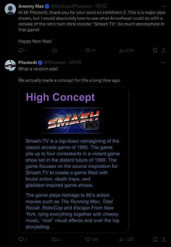 一位粉丝表示,非常希望看到工作室对复古双摇杆游戏《SmashTV》进行重新诠释,而 Pilestedt 则透露,实际上他在十几年前曾有过类似的想法,并分享了当时自己写的对游戏的概念描述。