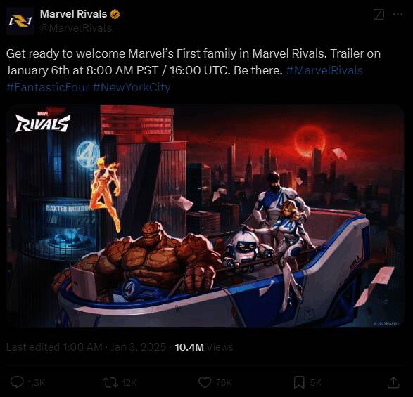 此外官方还表示新英雄的预告片将于1月6日放出,不过目前并未透露神奇四侠中的四位英雄将一同亮相还是逐个登场。