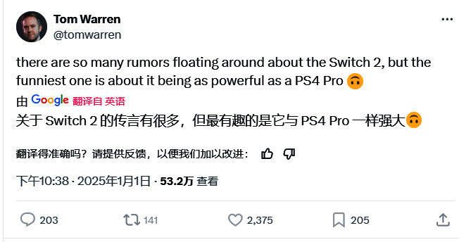 他说:“关于Switch 2的传闻满天飞,但其中一个最搞笑(离谱)就是说它和PS4 Pro一样强。”