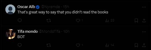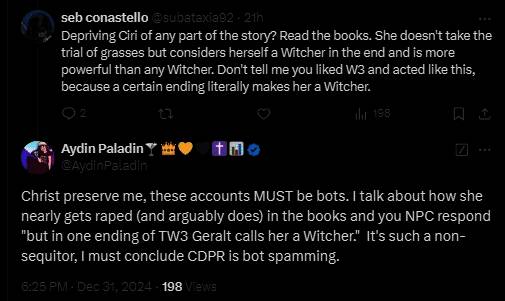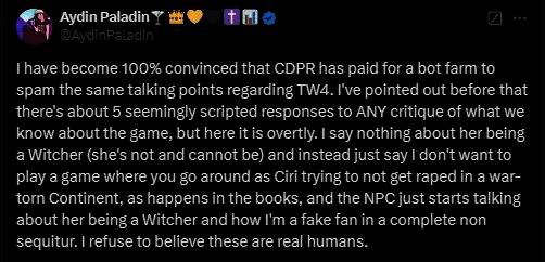 推特用户AydinPaladin认为,CDPR雇佣大量机器人水军来处理针对《巫师4》的常见论点。这些假冒真人的机器人账户开始谈论希里在书中是一名猎魔人,但其他许多玩家认为这不是事实,还有人注意到针对希里的过度辩护。
