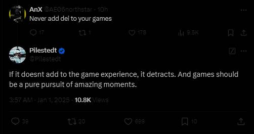 在讨论箭头工作室的下个游戏时,Johan Pilestedt回复了一名用户,后者表示希望永远不要加入DEI元素。Johan回复说:“如果它(DEI)不能充实游戏体验,那么他就会有损游戏体验。游戏应该纯粹地追逐惊人时刻。”