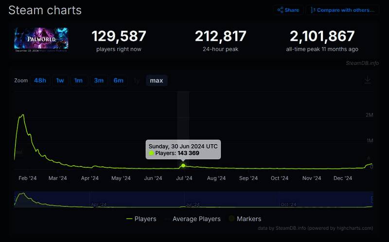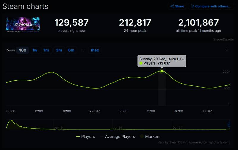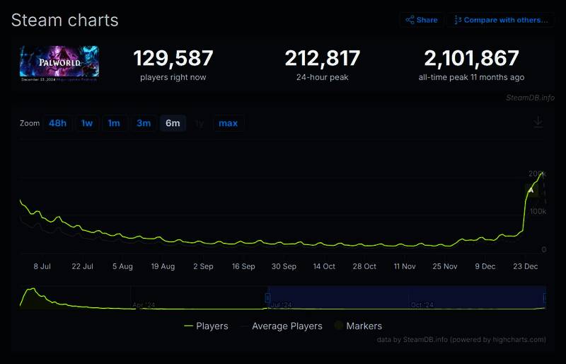 根据SteamDB的数据显示,“天坠之地”推出后在12月29日这天,《幻兽帕鲁》的同时在线玩家人数最高为212817人,这是继游戏6月推出“樱岛”更新后玩家数再度突破10万(当时最高峰为14万,更新推出前后在线峰值稳定在2万至5万之间)峰值。