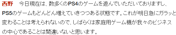 ·在被问到未来有一种云游戏取代硬件平台的趋势预测,索尼是如何考虑的关键问题时,西野秀明表示,如今仍然有众多的PS4游戏在不断推出,而且PS5的平台游戏也在不断更新,这种石头不会突然发生转变,我们毫无疑问的目前仍然以家庭主机平台为核心。