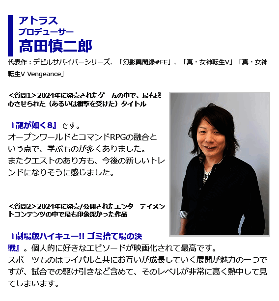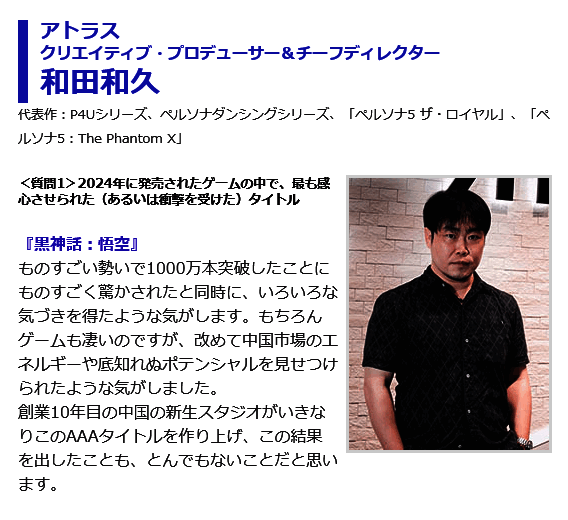 此外,这三位开发者今年最喜欢的游戏分别是《如龙8》(高田慎太郎)、《勇者斗恶龙3 HD-2D版》(前田直哉)以及《黑神话:悟空》(和田和久)。