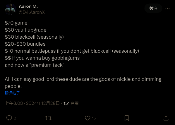 许多玩家对此非常不满。以为玩家说道:“想象一下,你每个赛季额外为 Blackcell 花 30 美元,然后他们还想从你这里挤出更多的钱。”另一位玩家抱怨道:“我只能说,天呐,这群人(动视)简直就是割韭菜之神。”